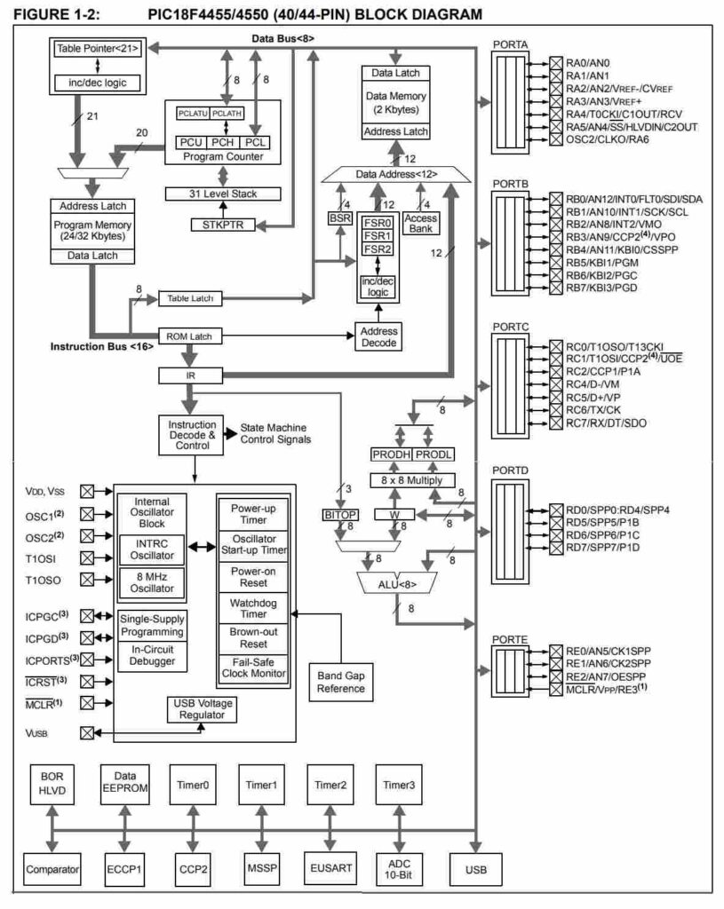 PIC18F4550 offers high performance, low power consumption, and excellent peripheral integration – making it an ideal choice for both beginners and professionals. Go through the picture, the architecture of PIC18F4550.